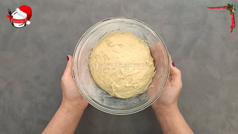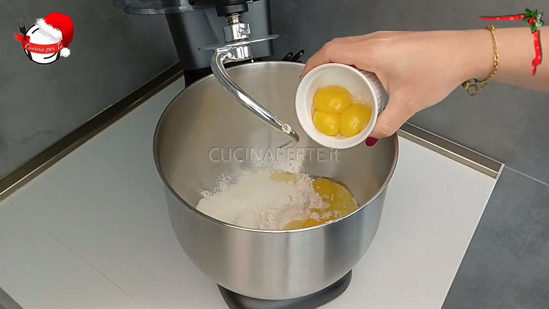 Versate le due farine setacciate nella ciotola di una planetaria. Unite il lievitino, 2 uova intere e 3 tuorli. Iniziate ad impastare tutto con il gancio a velocità media. Aggiungete l’acqua a temperatura ambiente e continuate ad impastare fino a quando il composto non risulterà omogeneo.