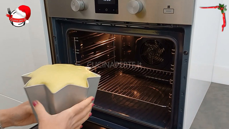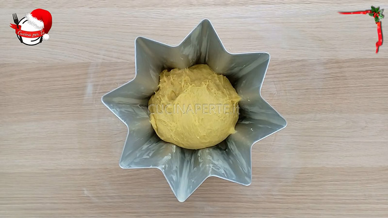 Formate un panetto rotondo e disponetelo nello stampo per pandoro precedentemente imburrato, con la parte superiore del panetto a contatto con il fondo dello stampo. Coprite con la pellicola e lasciate lievitare nuovamente per altre 6 o 7 ore in forno spento, fino a quando l’impasto non avrà raggiunto il bordo dello stampo. Se volete anticipare i tempi di lievitazione, potete preriscaldare il forno a 25°C. In questo modo basteranno circa 2 o 3 ore.